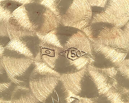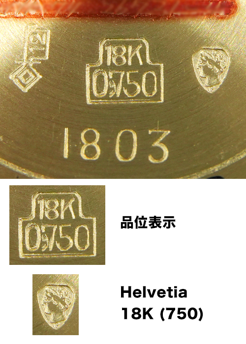 品位表示「18K 0.750」、スイス国内で製造された「Helvetia/ヘルヴェティア」(スイスを象徴する女性)が刻印されています。