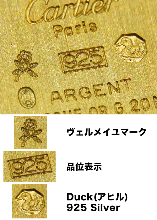 ヴェルメイユケースを表す「花の刻印」、「銀無垢(925SV)」の品位表示、スイス国内で製造されたことを示す「Duck(アヒル)」が刻印されています。