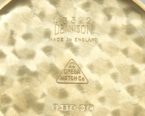 オメガはスイスのメーカーですが、本個体はイギリス市場にのみ供給されていた「デニソンケース」が使用されているため、品位表示などに関してもイギリスのホールマークが刻印されています。