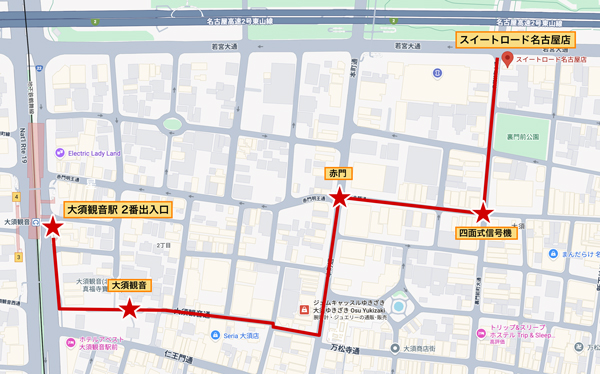 今回は、大須観音駅を起点に、大須観音、赤門、四面式信号機を経由し、スイートロード名古屋店まで少し楽しく歩けるルートをご案内します。