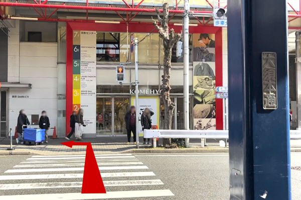 信号を渡り、突き当たりのコメ兵を左に曲がってください。