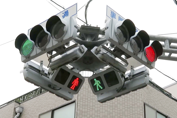ちなみに、頭上に見える信号機は1975年に設置された「四面式信号機」と呼ばれるものになります。