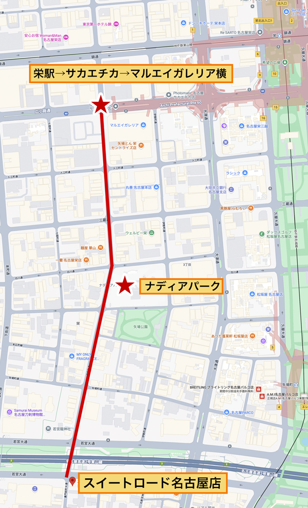 名古屋店は、栄駅、矢場町駅、大須観音駅から歩いてご来店できる立地です。